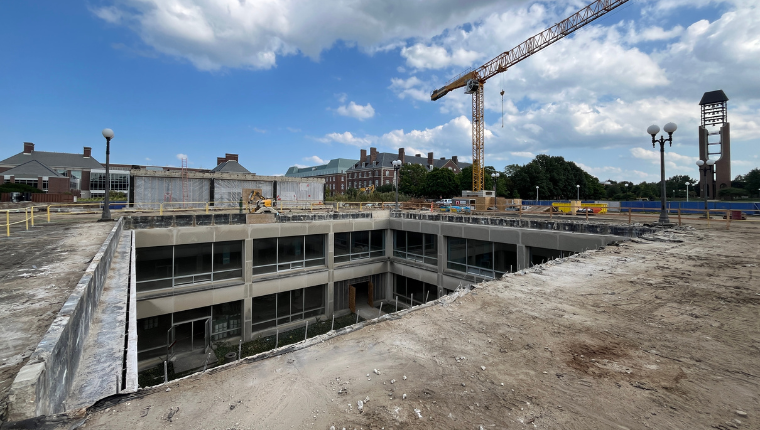 Recently, the installation of a tower crane has allowed for most of the demolished material to be removed from the lower level of the building. Currently, the following work is in progress: elevator excavation on the east side of the building has begun, replacement of deteriorated 1990s waterproofing around the perimeter walls and on the tunnel, finishing demolition of the west pavilion and demolition of the plaza to begin replacement of that waterproofing, beginning to salvage and restoration of courtyard limestone, and continuing mechanical and other demolition. Initial framing of some interior spaces is expected in the early fall semester.