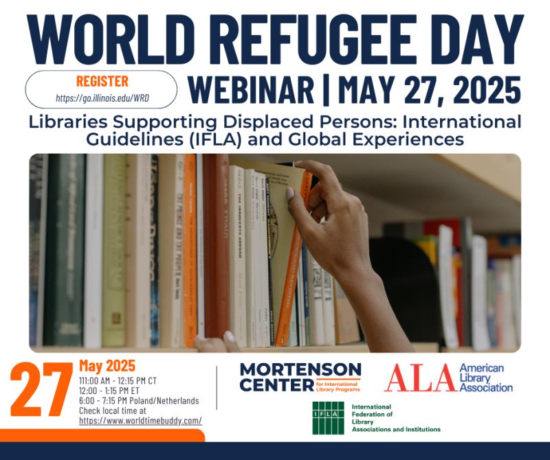 The Mortenson Centre in collaboration with the International Federation of Library Associations and Institutions (IFLA) and the American Library Association (ALA)’s International Relations Committee (IRC) and the Services to Refugees, Immigrants, and Displaced Persons (SRIDP) Sub-Committee ) organized a webinar commemorating World Refugee Day 2025 (June 20). The webinar was held on May 27, 2025, and highlighted the recently published IFLA Guidelines for Libraries Supporting Displaced Persons: Refugees, Migrants, Immigrants, Asylum seekers (December 2024), complemented by presentations on international experiences and/or research on providing library and information services to refugees and other displaced persons, with commentary on how the Guidelines may inform their work.