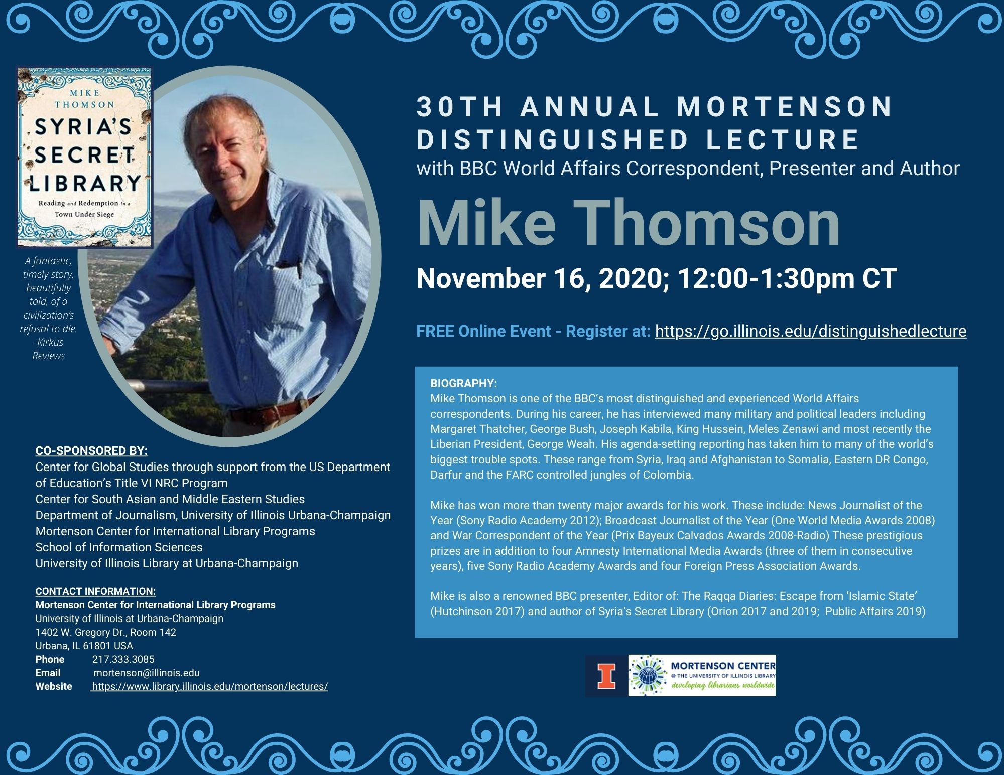 CO-SPONSORED BY: Center for Global Studies through support from the US Department of Education’s Title VI NRC Program; Center for South Asian and Middle Eastern Studies; Department of Journalism, University of Illinois Urbana-Champaign; Mortenson Center for International Library Programs; School of Information Sciences; University of Illinois Library at Urbana-Champaign