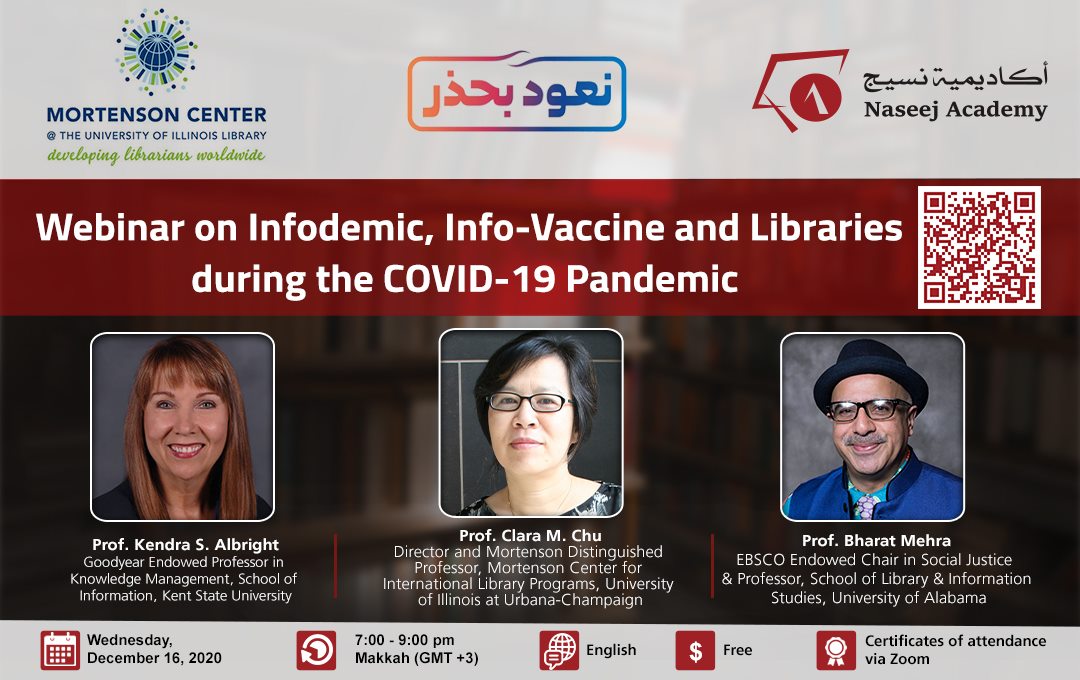 The Mortenson Center for International Library Programs and Naseej Academy will present a two-hour workshop on the infodemic during the COVID-19 pandemic for library and information specialists. It will introduce the COVID-19-related infodemic, the need for an information vaccine (Albright, 2016) and its significance for libraries. Then, it will explore solutions that library and information specialists can undertake, through a discussion of experiences with infodemics. The workshop will present ideas and actions that library and information specialists can undertake as solutions and prevent the spread of the COVID-19-related infodemic.