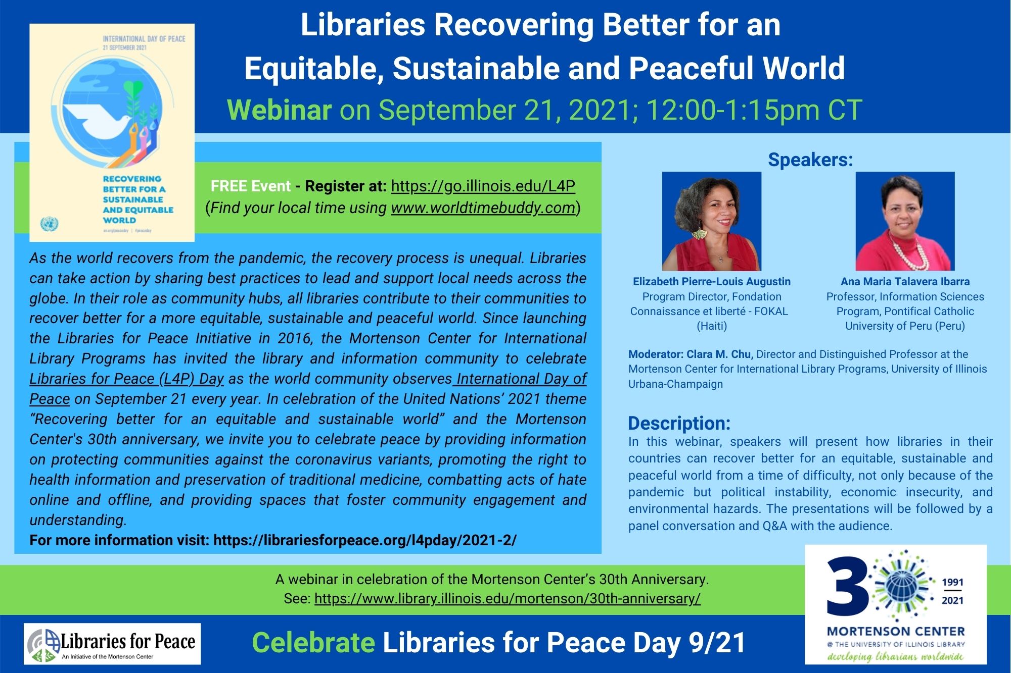 Since launching the Libraries for Peace Initiative, the Mortenson Center for International Library Programs has invited the library and information community to celebrate Libraries for Peace (L4P) Day as the world community observes International Day of Peace on September 21 every year. The United Nations General Assembly has declared this as a day devoted to strengthening the ideals of peace, both within and among all nations and peoples. The theme for the International Day of Peace in 2020 is “Shaping Peace Together”. In this panel discussion, association leaders will discuss how libraries can shape peace together, the ways that their associations provide leadership for libraries to shape peace together, and opportunities for library associations working with each other and/or other organizations to create collective impact in advancing peace.